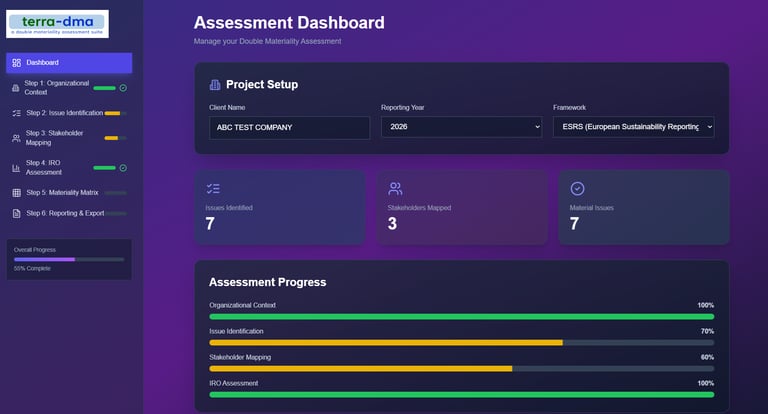 terra-dma guides you through the entire Double Materiality process. It automates data collection and IRO identification to clearly map out your most important ESG topics.